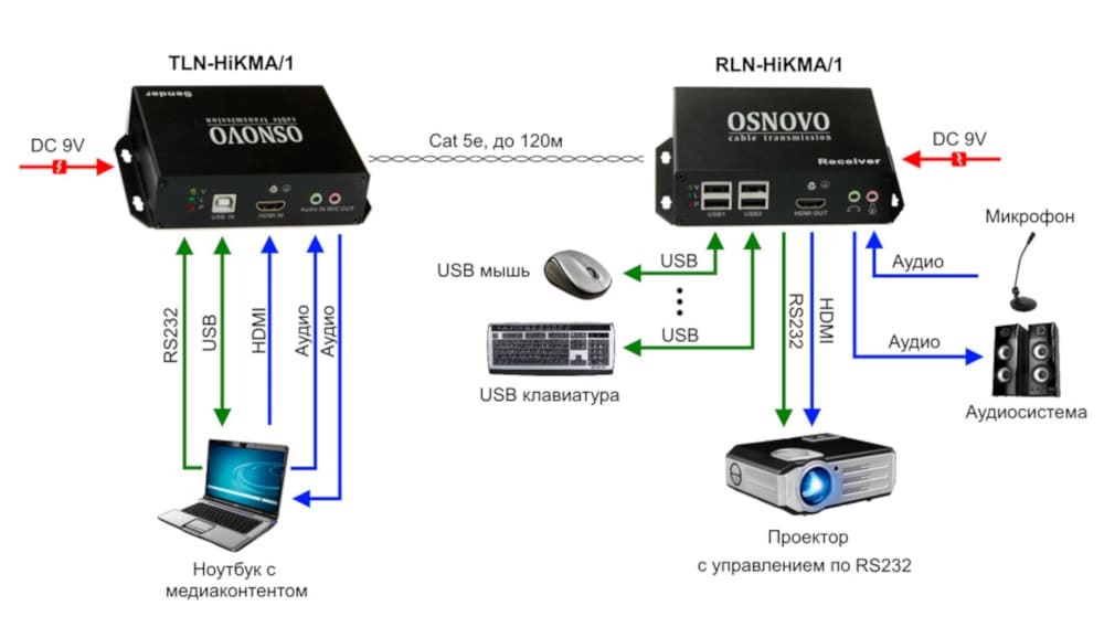 Комплект (передатчик и приемник) Osnovo TLN-HiKMA/1+RLN-HiKMA/1 предназначен для трансляции сигналов HDMI, USB, RS-232, ИК-управления и аудио по сети Ethernet. Поддерживает работу через гигабитный коммутатор (в комплект не входит) для увеличения расстояния передачи на 100 м.
