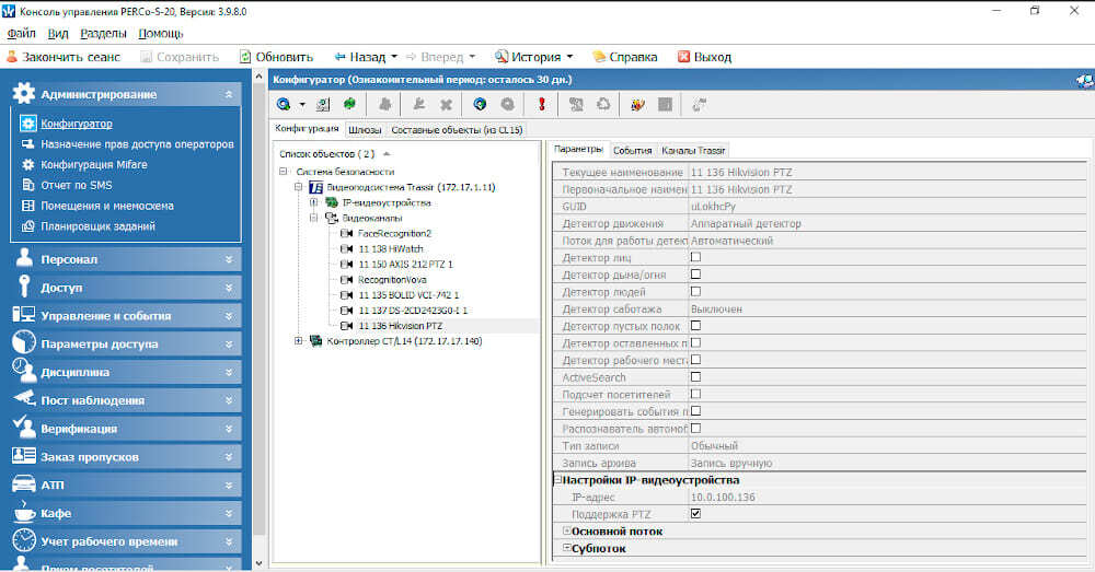 Модуль ПО PERCo SM20 для интеграции с системой видеонаблюдения TRASSIR расширяет функциональные возможности PERCo S-20 за счет использования оборудования TRASSIR (с лицензией на TRASSIR Server) и управления им, получения видеопотоков, отображения видео в реальном времени, просмотра видеоархива etc.