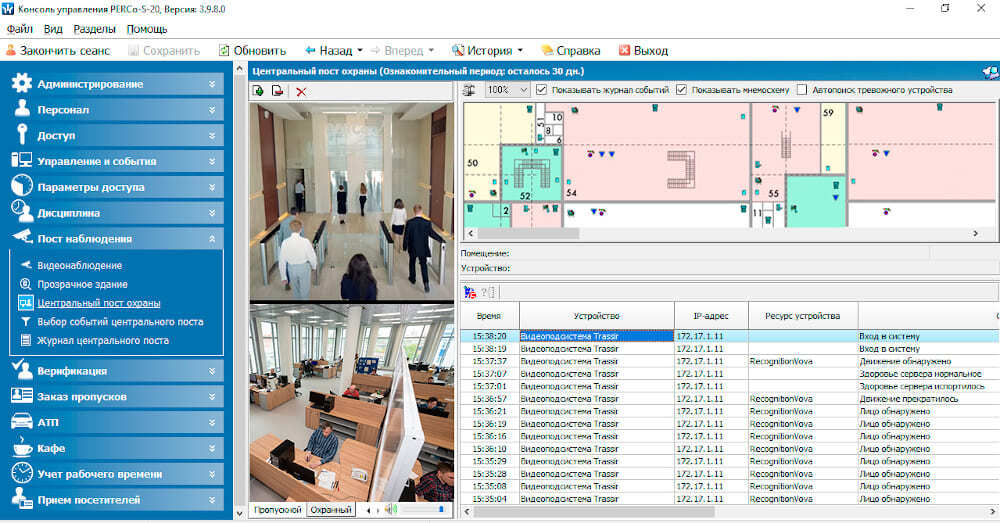 Контроль над объектом в интерфейсе PERCo-S-20 с выводом «живого видео» с камер видеоподсистемы TRASSIR через раздел «Центральный пост охраны».