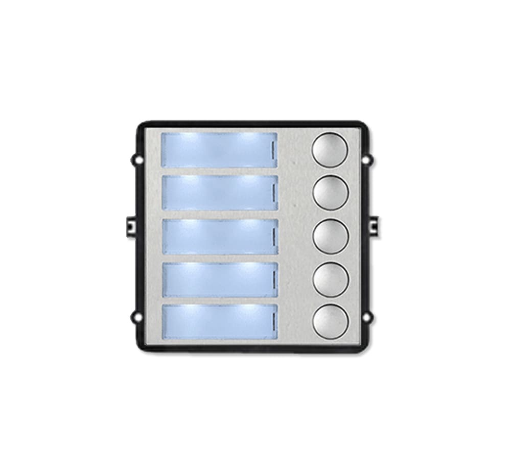 Дополнительный модуль True IP TI-2308M/5 в составе сборной вызывной панели расширяет функционал главного модуля TI-2308M/M на пять кнопок вызова абонента. Подключение к главному модулю и получение питания предусмотрено через RS-485. Энергопотребление в рабочем режиме —